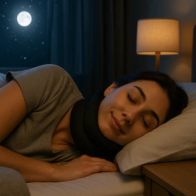 Fastgør den forsigtigt om halsen med den justerbare rem. Den former sig efter din figur for komfort hele natten.